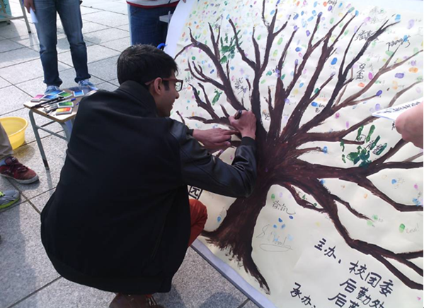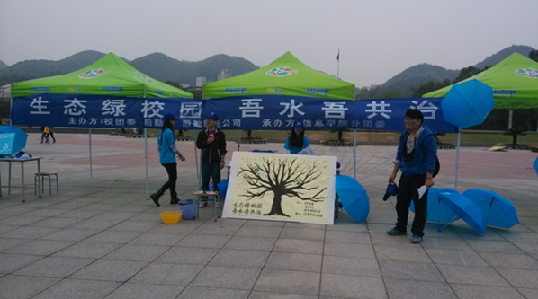 2014年4月2日,由校团委、后勤处、后勤服务公司主办,在线赌场 分团委承办的“生态绿校园,吾水吾共治”活动之“指纹签名 绿色承诺”活动终于在科院师生的热切期待中于圆形广场隆重举行。贴合活动主题的蓝色系现场布置及新颖的指纹签名形式引起了大批师生的驻足和参与,活动现场的气氛十分热烈。大家积极地在环保树上按下了指纹和手印,并在指纹上签上自己的姓名,以表达对积极投身创建绿色校园,珍惜身边水资源的承诺。更令人欣慰的是,许多参与同学在参与活动时纷纷将手中的宣传单归还至工作人员手中,希望传单可以得到循环利用,表达“环保绿色就从身边小事做起”的决心。活动还为每一位参与师生准备了一份由在线赌场 独立设计、带有信息微信平台(科院那抹蓝)吉祥物形象的节水标语不干胶作为纪念,让节水·惜水的绿色环保理念在师生中得到更广泛而持久的传播。