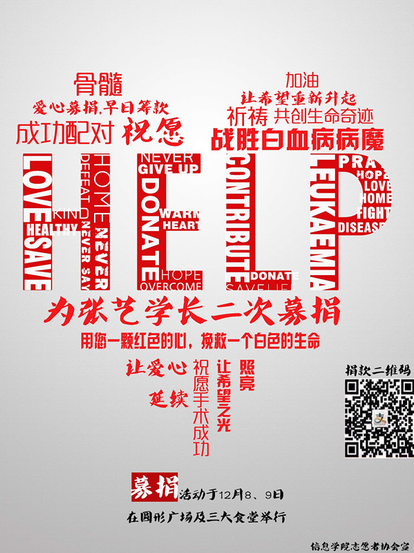赠人玫瑰,手留余香;一方有难,八方支援。亲爱的老师、同学们,请伸出你们援助之手,献出你们关爱之心,去成全一份勇敢的坚持,传递一份生命的热度。帮助张艺学长战胜病魔,因为他需要你、需要我、需要我们大家共同的努力!在这争分夺秒的时刻,多一份力量就多一份希望;多一份爱心就多一份温暖。让我们立刻行动起来,用我们的爱、我们的心,去点亮一盏希望的明灯,使枯竭的生命之花重新绽放,让干涸的生命之河永流不息!