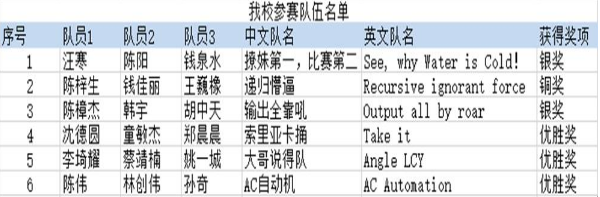ACM竞赛基地,进行了艰苦训练。参赛师生利用业余时间开展算法学习、模拟训练和讨论交流,并利用寒暑假在学校开展封闭式集训。在激烈的新生赛、校赛PK后,选送6支队伍参加省赛,在省赛中绽放出属于自己的风采。接下来,我校ACM集训队还将角逐ACM/ICPC国际赛,在此预祝他们取得更好成绩,为校争光。