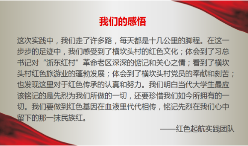 红色起航实践团队作为第十一支队伍上台展示。为了进一步学习红色文化,传承红色精神。红色起航团队以“重走抗战路,为颂革命红”为主题,来到了被誉为“浙东红村”的浙江省余姚市梁弄镇横坎头村。我们参观了浙东抗日旧址群、正蒙学堂、革命烈士纪念碑、四明山革命事迹陈列馆等红色旧址;采访老党员,接受爱国主义教育;调研革命老区乡村振兴模式和青少年红色基因传承;同时,团队利用所学知识为余姚市中小学实践基地拍摄了一支宣传片。团队活动也得到了团省委、当代大学生网、大学生之家、中国大学生网、浙江省学联、和山青年等微博,网站,公众号的关注和报道。