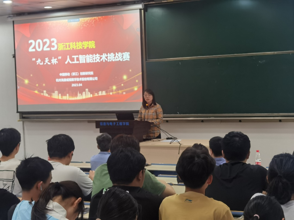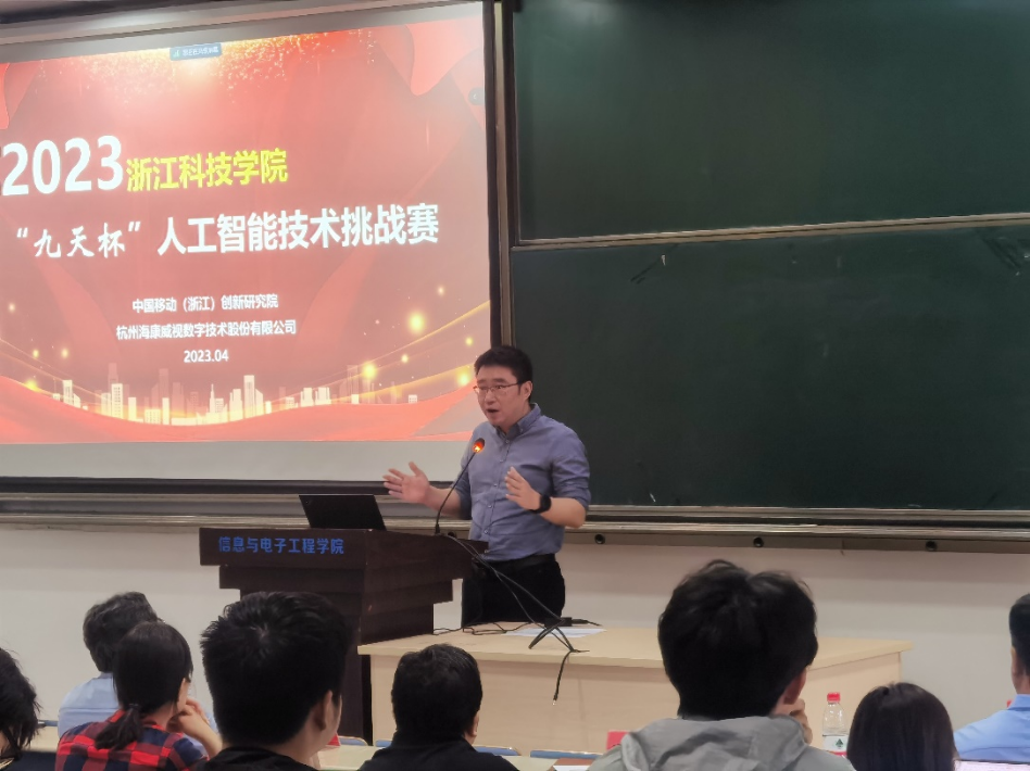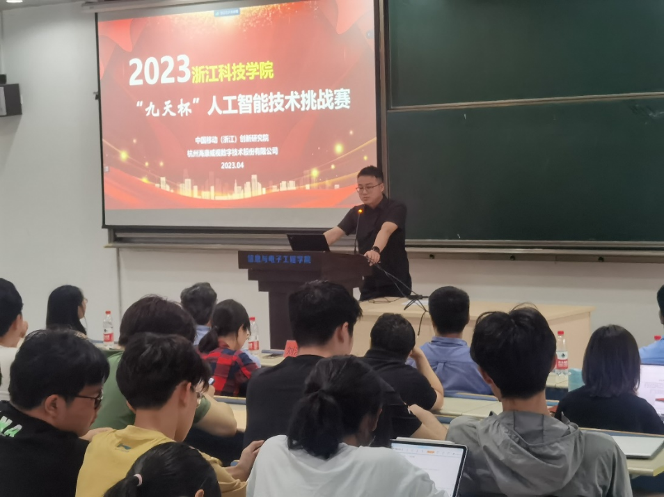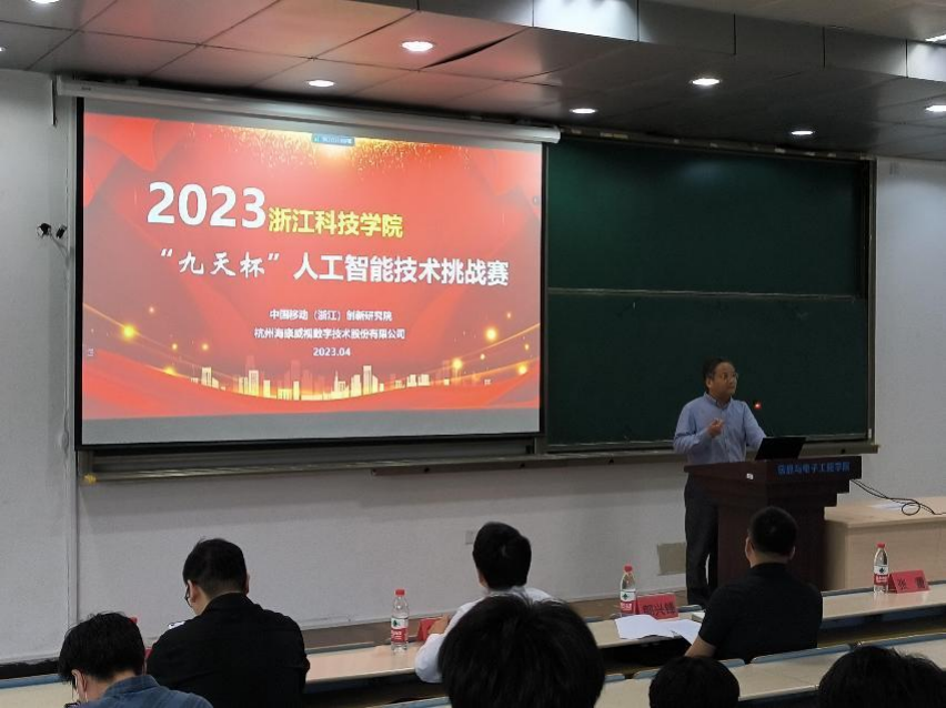 、电气学院、理学院等相关专业教师与学生近200人参会,安吉校区部分学生通过视频会议方式参加。教务处副处长刘洪民代表学校对竞赛的举办表示欢迎,感谢合作企业的大力支持,并介绍了学校对学科竞赛的政策支持以及近年来所取得的成绩。信息与电子工程学院书记张蕾肯定了企业命题对锻炼学生应用创新能力的重要作用,希望今后能够进一步深化多种形式的校企合作,鼓励学生积极参加竞赛,预祝取得好的成绩。中国移动(浙江)创新研究院副院长蒋健重点介绍了本届“九天杯”人工智能技术挑战赛的相关信息,并分享了中国移动九天・毕昇平台为高校师生所提供的人工智能领域的课程学习、竞赛、科研、求职、教学等一站式云端服务。海康威视杭州分公司郭兴锋总监介绍了公司二十年来的发展历程与在新时代背景下公司的转型,并邀请学生未来能够加入海康威视。