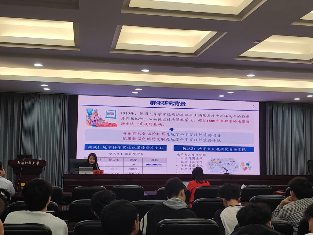 讲座中,傅洛伊副教授指出,随着文献数量呈指数级增长,地理学家面临海量资料难以全面掌握的困境,使地学研究资源受到严重制约。在此背景下,如何有效利用海量有机数据并挖掘数据间的关联,成为地球科学发现的重要突破口,这也促使他们团队致力于知识图谱技术的研究。傅教授重点介绍了其团队在地学大数据的结构化表示与深时空计算方面的研究成果,从"数、图、算"三个维度为在场师生进行了生动的讲解。
